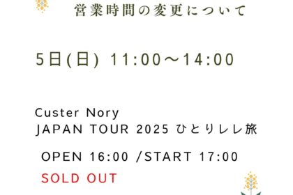 ライブのため営業時間が変わります。 14:00まで(L.O 13:30)となっております。 なお、ライブはSOLD OUTです。