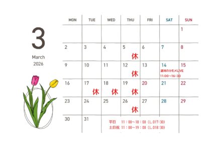 3月から一部、夏時間。土日祝日は19時まで営業いたします。平日は18時までです。 14日(土)運河のカモメ 札幌ライブ2026開場 1...