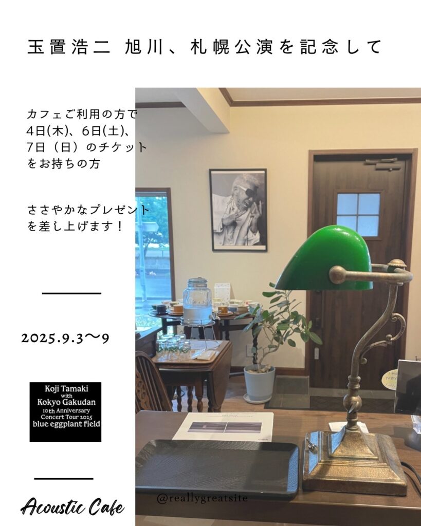 今回のツアーもやります! 玉置さんの旭川、札幌公演のチケットを持っていらっしゃる方。 カフェご利用時に提示していただくとささやかながらプレゼントを差し上げます。9/3〜9まで。 ご来店お待ちしております。