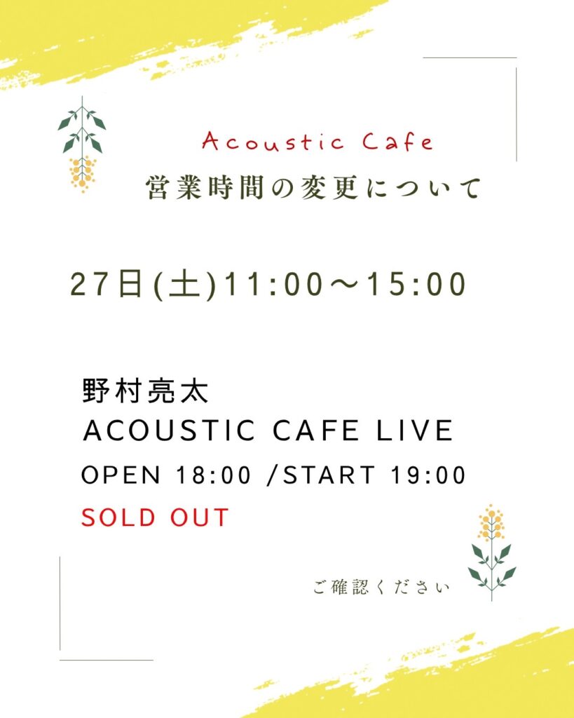 野村亮太さんライブのため営業時間は15時まで(L.O14:30)とさせていただきます。