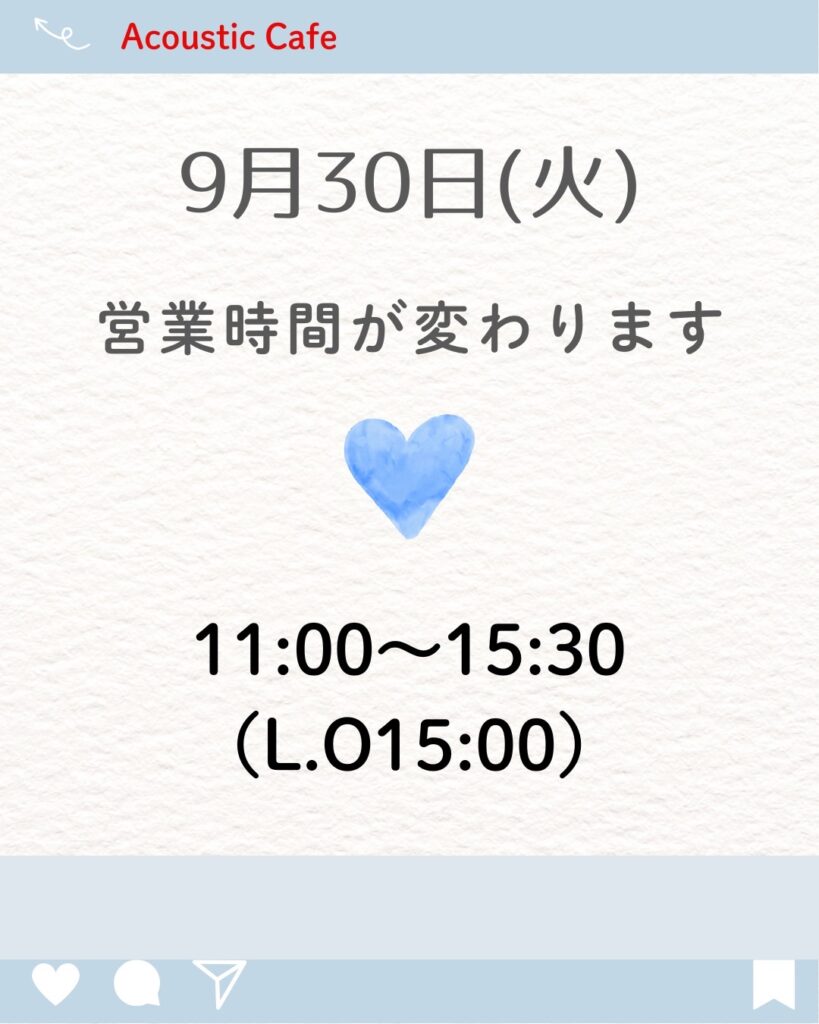 9月30日(火)は15:30(L.O15:00)までの営業とさせていただきます。
